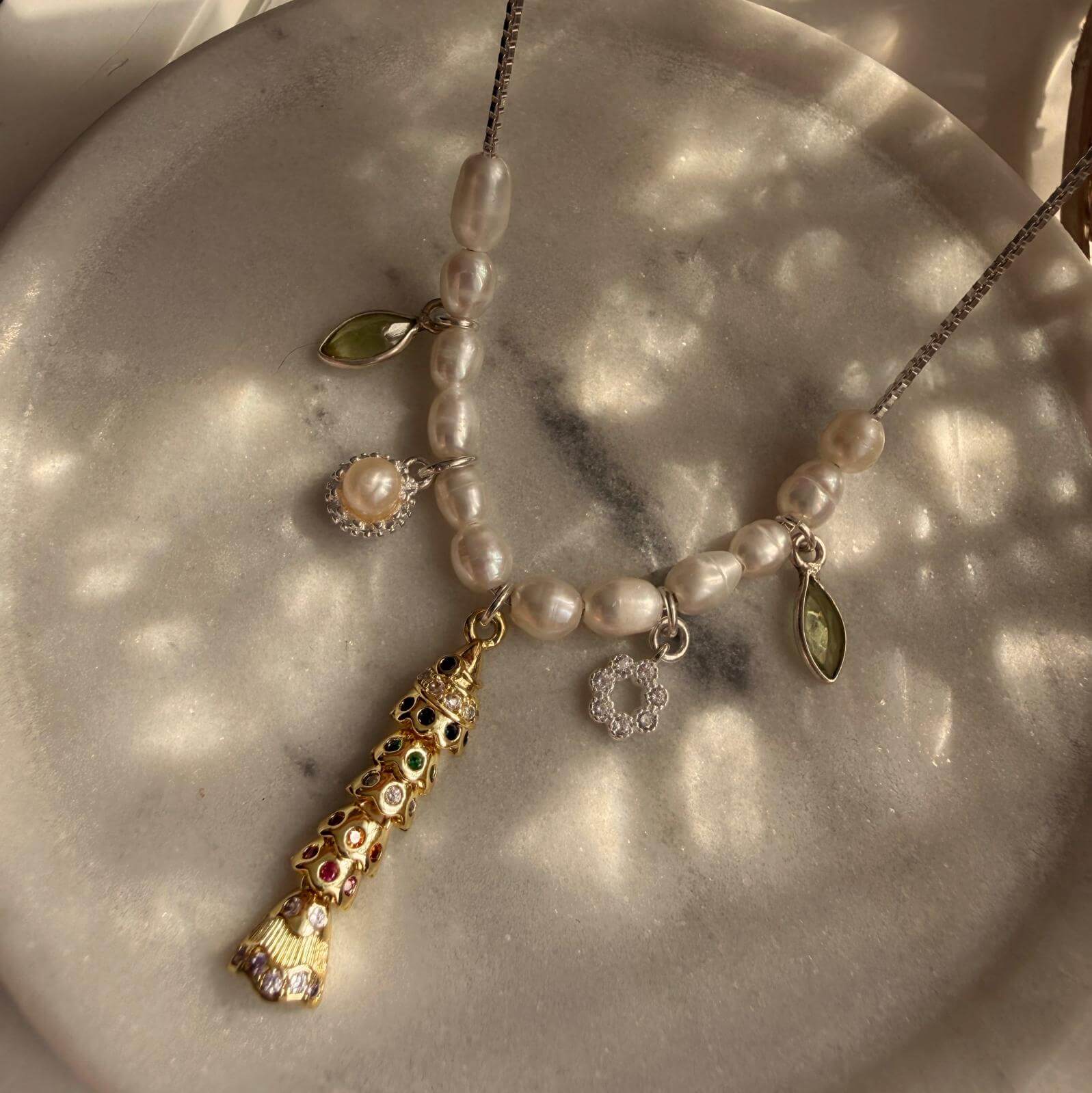 פנינים ואבני פרידוט טבעיות בגוון ירוק ליים משגע